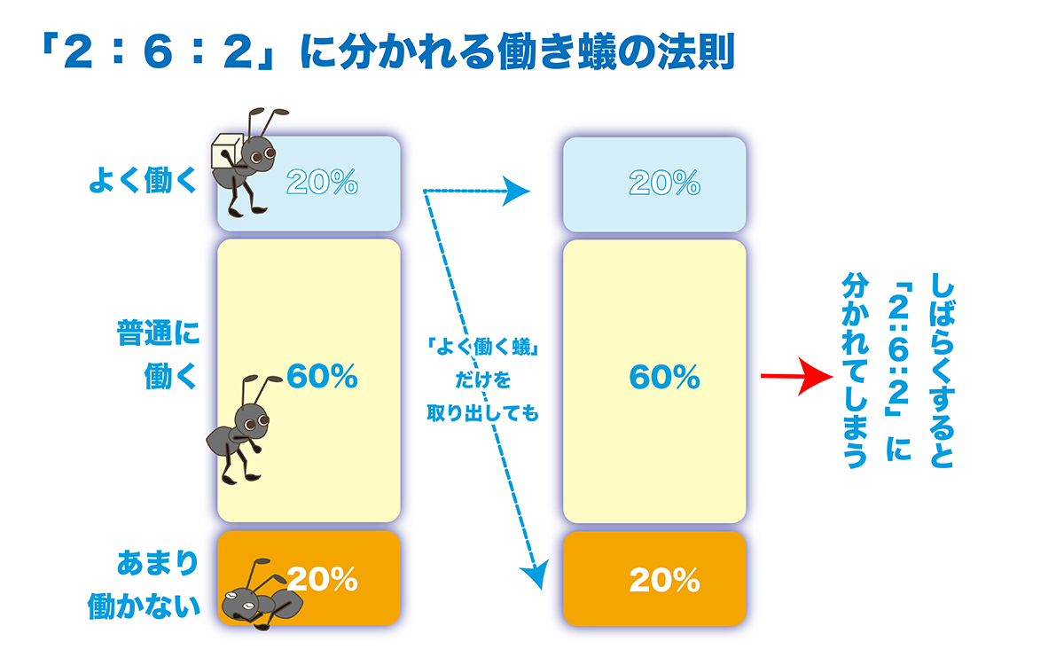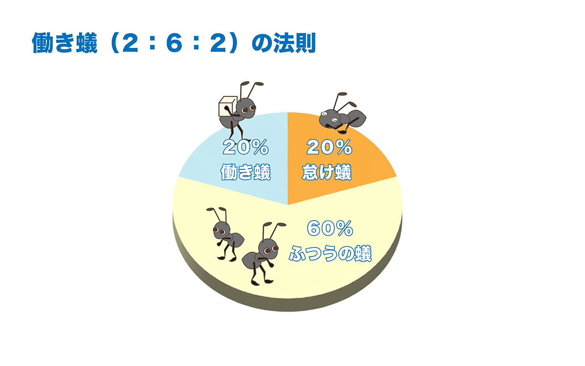 前述の「2:8の法則」から派生したと言われるのが「2:6:2の法則」で、別名「働きアリの 法則」と呼ばれています。