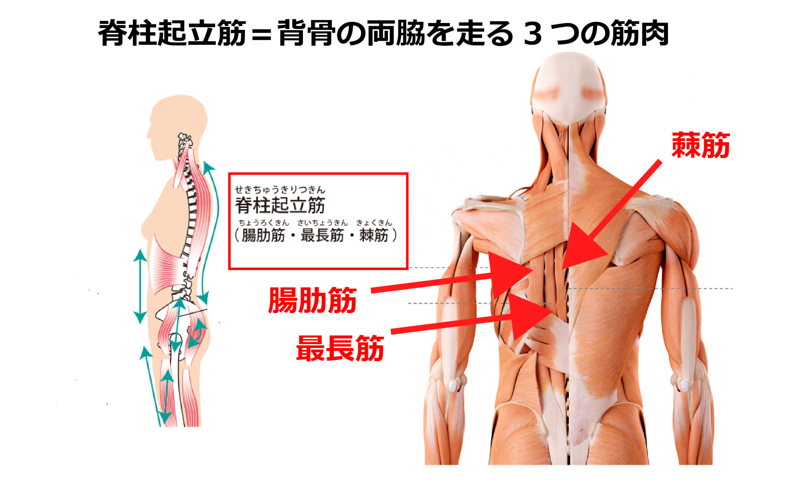 脊柱起立筋とは、腸肋筋、最長筋、蕀筋からなる筋肉で、首から腰にかけて背骨の両側を走っています。人間が直立できるものこの筋肉が背骨を支えているからです。