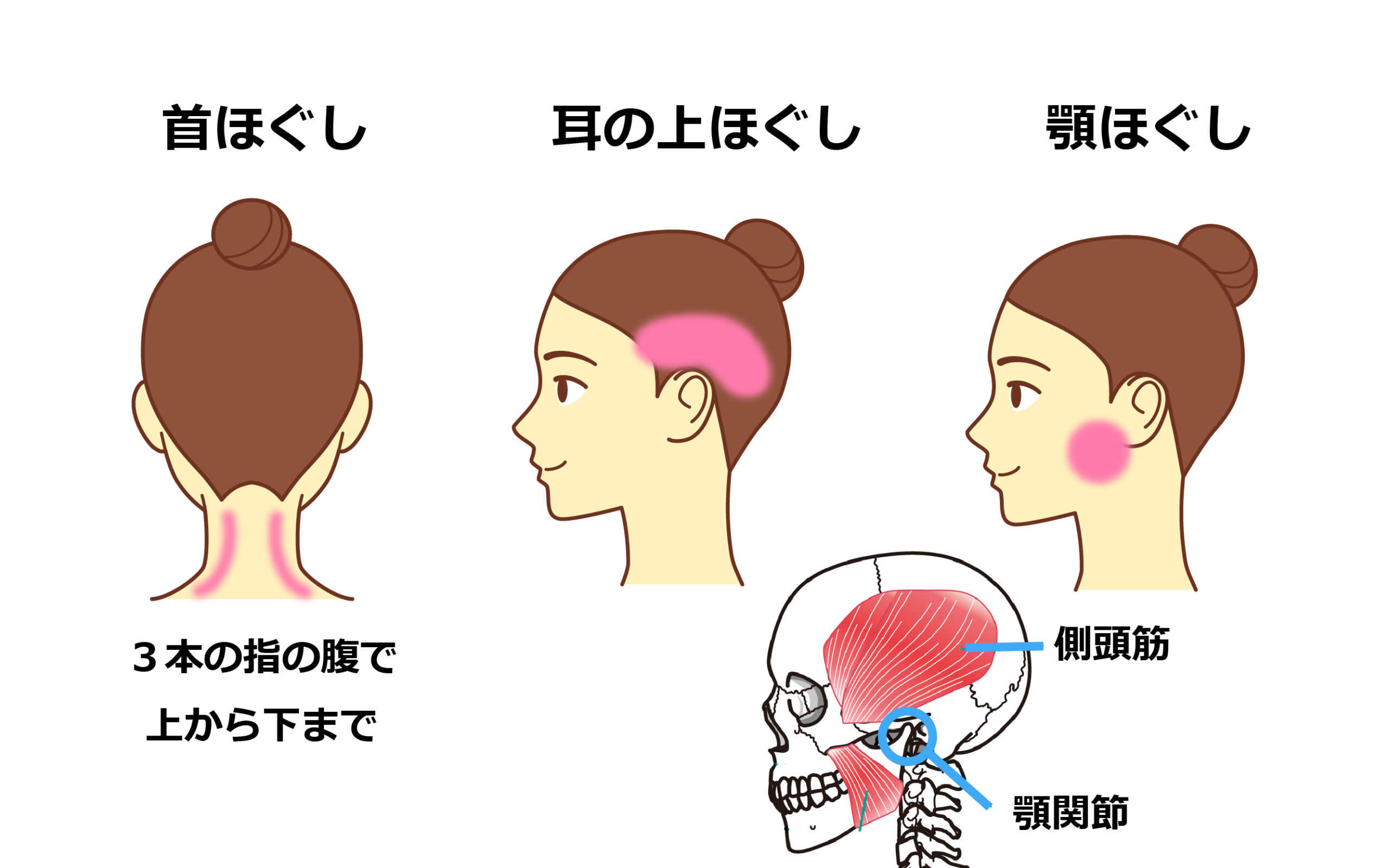 ここにある側頭筋をしっかりほぐすことで、頭の周りに血がめぐりやすくなります。
