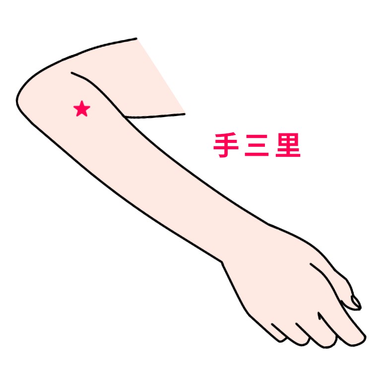 手三里は肘を曲げた時に出来るシワから分手首に向かって指三本の位置にあります。
