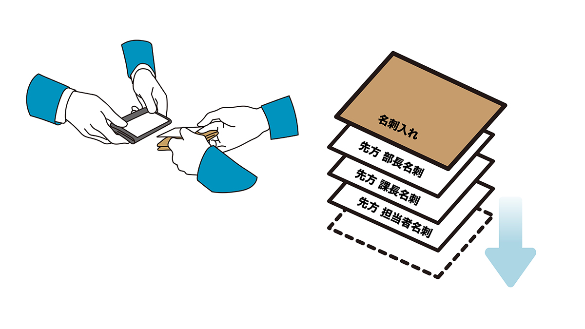 - 名刺交換をして、受け取った名刺は、名刺入れの下に重ねていきます。